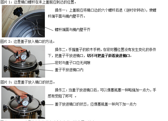 上蓋和卸蓋時應注意螺桿端頭的位置,滿足本說明書前述的要求。擰入螺桿時除了要符合“上蓋”章節的要求外,在擰入螺桿時,螺桿端頭切不可擠壓鍋蓋圓周表面。螺桿端頭擠壓鍋蓋圓周面會使鍋蓋變形,輕者漏氣重者鍋蓋損壞從此無法密封。
