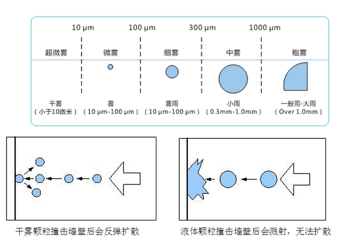 當液滴的平均直徑小于10微米時,噴出霧可以被稱作是“干”的;小的液滴會從墻面上彈開并且不會破裂附著使表面潮濕。而所有的條件的建立都是為了滿足殺孢子劑以氣化的形式有效地移動到指定的區域,這種形式的特性決定了它們可以移動到平時難以達到的區域。