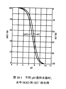 HOCl和OCl-的比例與水中溫度和pH有關。pH高時,OCl-較多。 pH>9,OCl-接近100%。 pH<6,HOCl接近100%。