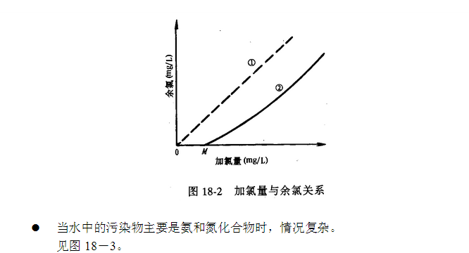 余氯:出廠水接觸30分后余氯不低于0.3mg/L;在管網末梢不應低于0.05mg/L。 加氯曲線: ? 水中無任何微生物、有機物等,加氯量=余氯,圖18-2中的① ? 水中有機物較少時,需氯量滿足以后就是余氯。圖18-2中的②
