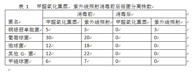 4.3紫外線照射消毒法 在各醫院較廣泛地應用其殺菌原理是紫外線光使微生物的 DNA 產生誘變和致死。但紫外線照射強度及消毒效果受多種因素影響 ,從表 1 兩種消毒效果比較可知甲醛氧化熏蒸消毒優于紫外線照射消毒法。甲醛氧化熏蒸消毒效果顯著 ,取材方便、制作簡單 ,置入箱內消毒不受其他條件影響。此方法在基層醫院更具有實用性。